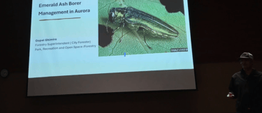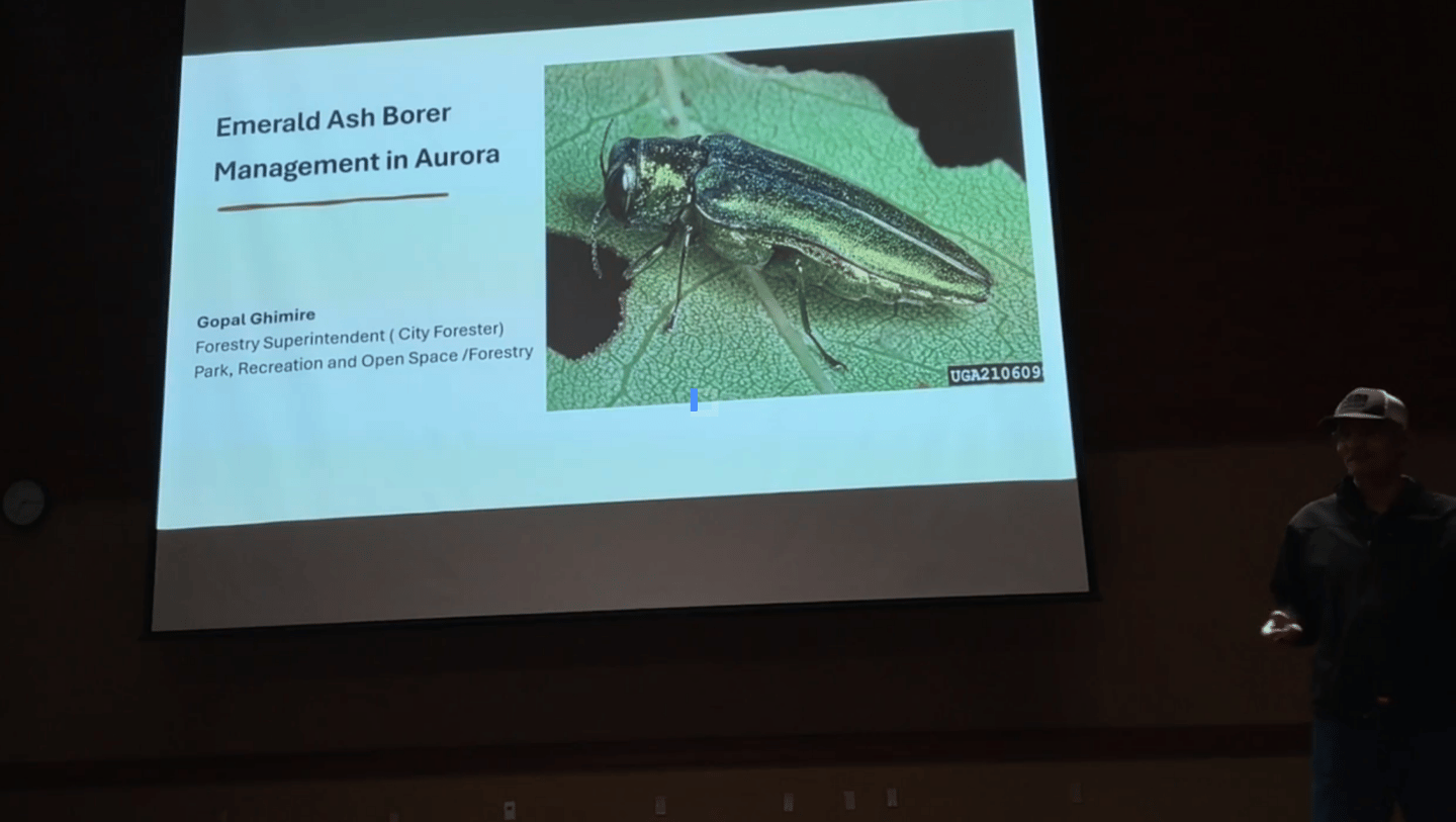 The city forestry superintendent Gopal Ghimire talked about the invasive Emerald Ash Borer beetle killing ash trees. In my opinion the color of the beetle is similar to a june bug. Long story short ash trees are going to be extinct in Denver metro. The only Ash trees that will survive are the trees that are chemically treated. You have to treat a tree every two years to protect it & it is expensive to do so because Gopal said you should get a arborist or tree service company to apply the chemical. Like everyone has money in their pocket to pay for that (sarcasm). The city of Aurora stopped planting ash trees. You can buy the pesticide at Home Depot. According to Gopal the only predator the beetle has is a woodpecker. But Gopal said that woodpeckers used as a control method would only be useful in a non urban setting. After the engineer did what most engineers do which is kill most of the people in the room by the term “death by power point”. Talking about trees lead to a current tree related Aurora city code controversy that would cost a home owner a lot of money.