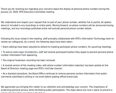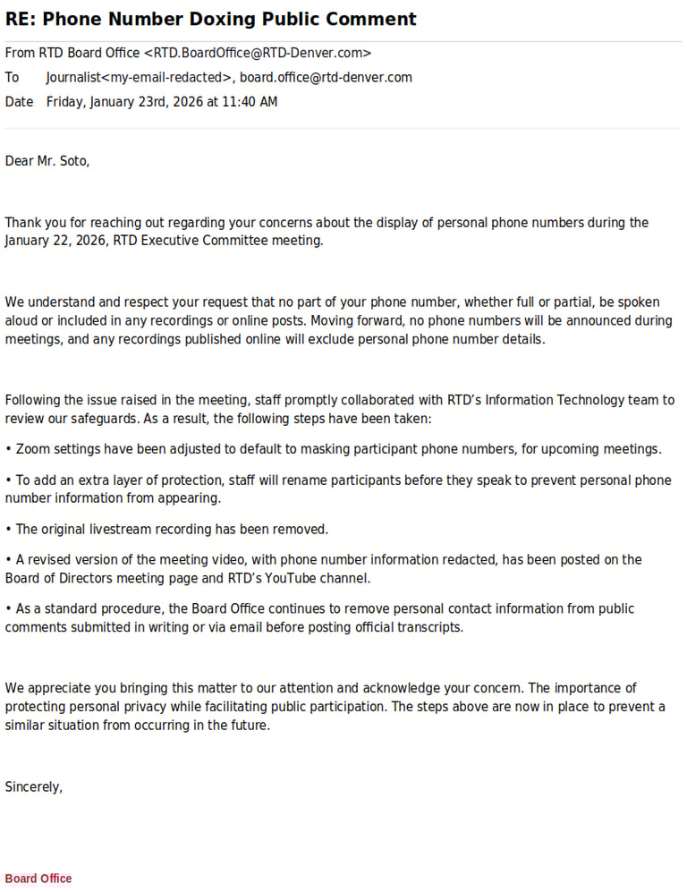 I can only speculate but I believe that RTD Executive board members intentionally Doxxed me. I asked myself the question did they also expose the personal information of people who spoke at public comment in PAST RTD board meetings? From what was recorded and posted on RTD’s YouTube channel. I saw one video showing the first 6 numbers of a woman's phone number on a recorded meeting. Was the remaining last 4 digits exposed during the live meeting? Phone numbers are personal information. First, last names and date of birth is not private, but is public information. I pull public records & if the records office is doing their jobs they will redact phone numbers & addresses. Now this could be ignorance by the executive board. But if they are that stupid, ignorant & incompetent they should not be on the executive board.