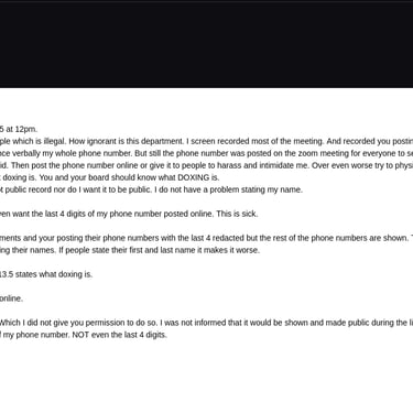 Scenario #2: A lot of people show up to a public comment meeting online from both sides far left and far right. Their is a very controversial topic that is upsetting people and going viral online. The people who speak at the meeting have their phone numbers shown during public comment. A few bad people from both sides write down the phone numbers and post them on various social media sites. The public speakers get harassing phone calls, threats & even death threats.